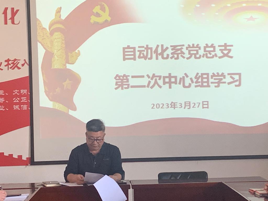 2023年3月27日下午,自动化系党总支理论学习中心组举行2023年第二次集体学习,集中学习了全国人民代表大会常务委员会工作报(摘要),以及习近平总书记在参加十四届全国人大一次会议江苏代表团审议时发表重要讲话精神,与会人员就牢牢把握高质量发展这个首要任务的相关会议精神进行学习研讨。中心组成员参加会议,党总支书记张云龙主持会议并讲话。