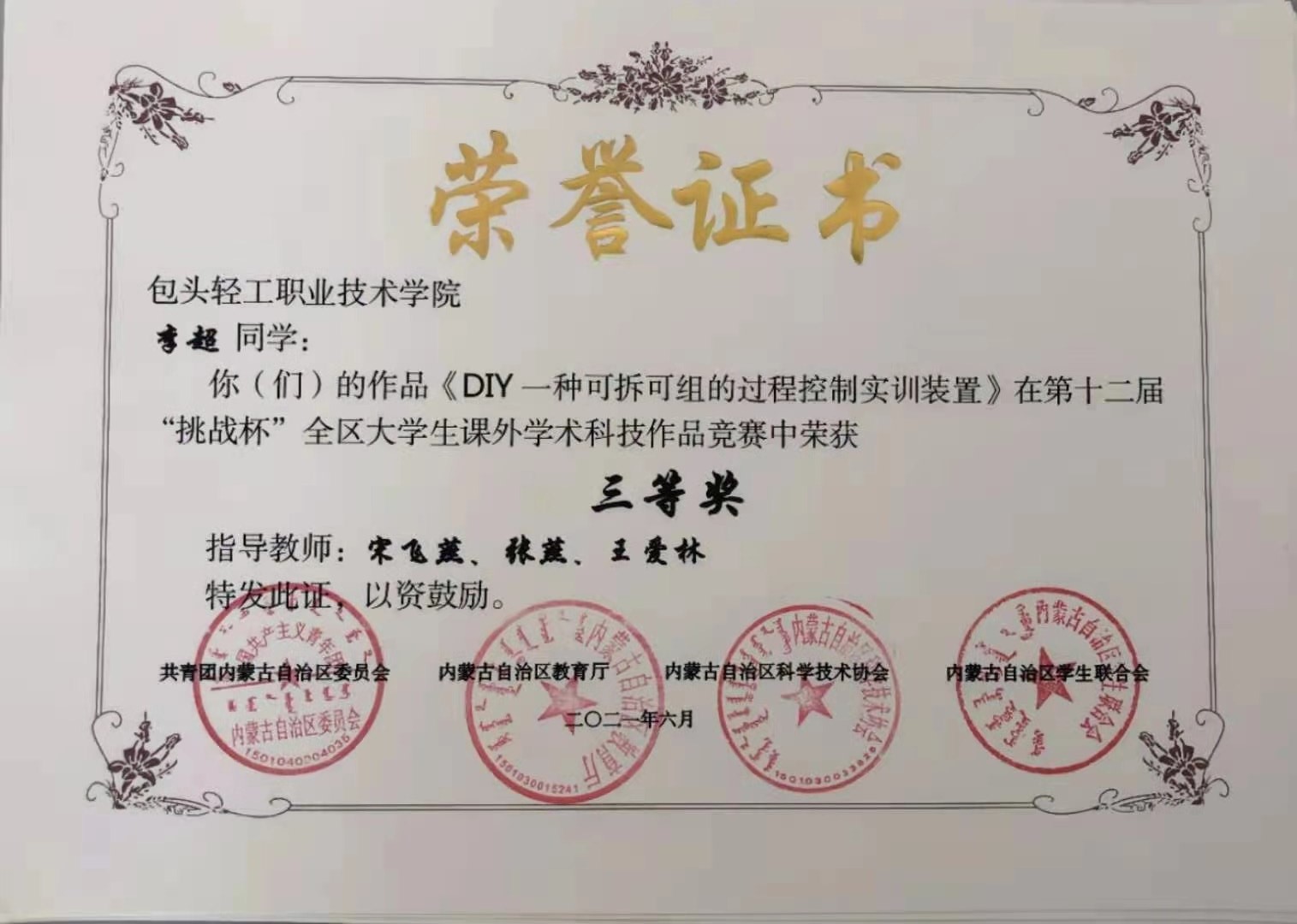 近日,包头轻工职业技术学院自动化系在由共青团内蒙古自治区委员会、内蒙古自治区教育厅、内蒙古自治区科学技术协会、内蒙古自治区学生联合会联合举办的内蒙古自治区第十二届“挑战杯”全区大学生课外学术科技作品竞赛中获得二等奖两项,三等奖六项的佳绩。
