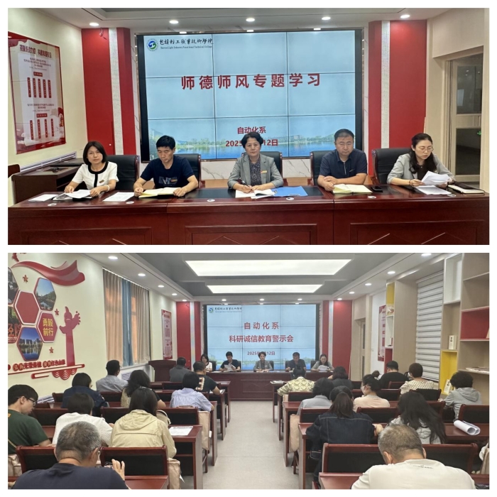 会上,系副主任赵玮带领全体教职工学习了《包头轻工职业技术学院师德师风教育管理办法》《包头轻工职业技术学院师德师风考核评价的实施办法》,结合文件中的考核指标、奖惩机制及师德规范要求,逐条款解读“何为合格师德、如何践行师德”,明确将师德师风考核结果与教师评优评先、职称晋升、绩效评定直接挂钩,推动师德建设从“软性要求”转为“刚性约束”;同时,通报了科研诚信违规行为典型案例,起到了良好的警示作用。