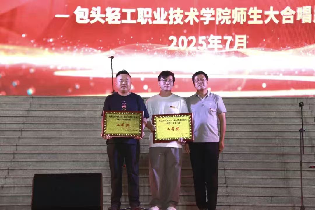 值得关注的是,大合唱队伍的服装选择别具匠心 —— 统一身着三家合作企业的工服,这一设计既紧密结合自动化专业的实践属性,更以工装为载体,生动诠释了精益求精、严谨专注的工匠精神。比赛伊始,一段铿锵有力的诗朗诵拉开序幕,字句间既表达了对党的辉煌历史的深情礼赞,也抒发了对美好未来的坚定畅想,彰显了全体轻院人的豪情万丈,为合唱环节奠定了厚重而激昂的基调。随后,他们倾情演唱了经典曲目《祖国不会忘记》,激昂嘹亮的歌声响彻赛场,既饱含着对祖国的深切热爱,又唱出了师生团结奋进、勇担时代使命的磅礴力量,最终凭借出色表现荣获二等奖。